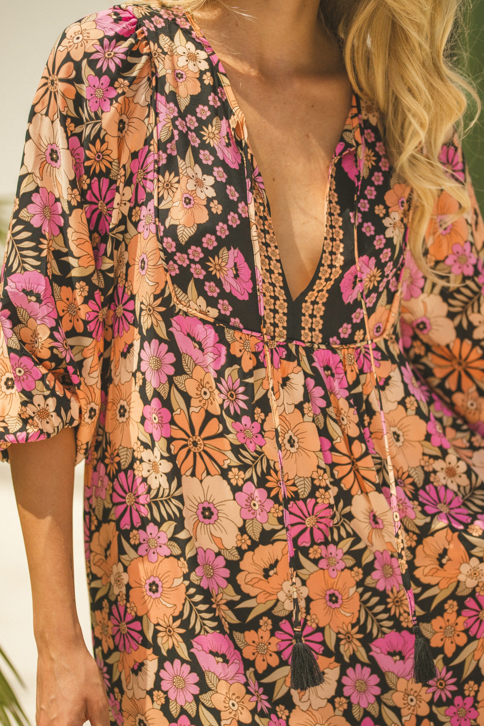 Losvallende jurk met V-hals waarlangs touwjes met flosjes hangen. 2 steekzakken, 3-kwart mouw met elastiek aan de onderkant. Twee anders geprinte stroken aan de onderzijde. Ook leuk met een grovere sneaker. 100% Viscose.